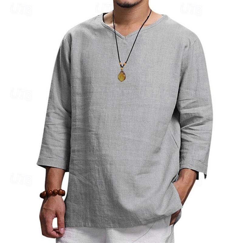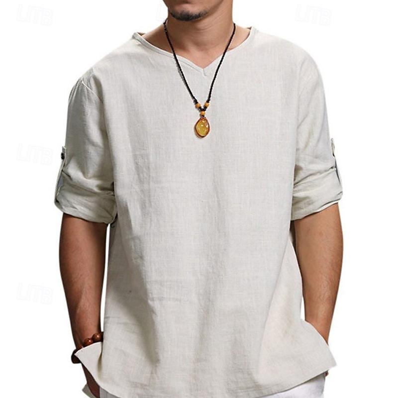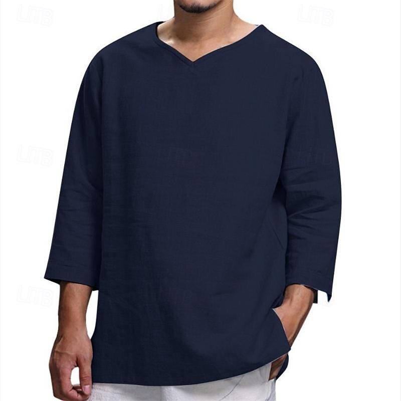 Highlights [Fabric] : Crafted from premium polyester, this men's linen shirt offers a breathable and lightweight experience, making it ideal for spring and fall seasons. The fabric’s air-permeable nature ensures comfort in warmer weather. [Fit] : This shirt features a relaxed fit with long sleeves, providing a slightly loose silhouette that enhances movement and adds to its casual, pleasant style. [Design Highlights] : The enduring V-neckline paired with long sleeves offers a blend of sophistication and versatility. Its plain pattern and solid color options—Black, Beige, Navy Blue, Gray, Khaki, and Light Blue—make it a timeless wardrobe staple. [Occasions] : Perfect for vacations, holidays, casual daily wear, and streetwear, this shirt transitions effortlessly from a day at the beach to a relaxed evening gathering, ensuring style and comfort across various occasions. [Size Range] : Available in sizes M, L, XL, 2XL, 3XL, and 4XL, this shirt caters to a wide range of body types, providing a comfortable and flattering fit for everyone.