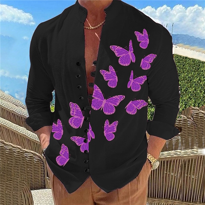 in-demand ! Men's Butterfly Shirt Long Sleeve Casual Daily Wear Going out Weekend Spring & Summer Standing Collar Print Button-Down Black White Blue Purple Fuchsia