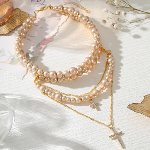 Layered Pearl Necklace Statement Y2k Pearl Cross Necklace Stacked Rhinestone Pearl Necklace for Women (Gold)