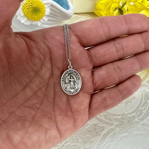 • Intricately designed large, oval Sterling Silver pendant measuring 3/4-inch tall by 1/2-inch wide. Inscribed with SAINT JOAN OF ARC PRAY FOR US.