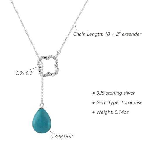 Material: Sterling SilverMetal type: Sterling SilverClasp type: LobsterChain type: BoxGem type: TurquoiseStylish and Eye-Catching Design: Make a statement with this unique Y-necklace, featuring a delicately hammered four-leaf clover and a drop-shaped turquoise pendant. Its distinctive design ensures you stand out in any crowd, adding a touch of elegance and charm to your look.Hypoallergenic 925 Sterling Silver: Crafted from 925 sterling silver, this necklace is hypoallergenic, making it safe for those with sensitive skin. The sterling silver construction also guarantees durability and a lustrous shine that lasts.Premium Presentation in a Gift Box: Your necklace arrives in a high-quality, waterproof, and dustproof gift box, perfect for safekeeping and gifting. The sophisticated packaging is ideal for various festive occasions, making it a thoughtful present for loved ones.Adjustable Length with Extender Chain: This fashionable necklace offers an 18-inch length with an additional 2-inch extender chain, providing flexibility to suit different necklines and outfits. Easily adjust the length to find the perfect fit for any occasion.Versatile for All Occasions: This Y-necklace is not just a piece of jewelry; it's a timeless accessory that complements any attire, from casual to formal. Its classic design and premium materials ensure it remains a favorite for years to come, suitable for everyday wear or special celebrations. Perfect for everyday use. superior materials and excellent craftsmanship ensure long-lasting durability.