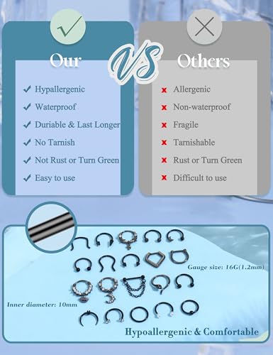 • robust & hassle-free to Wear: The septum jewelry 16G features secure closures for hassle-free wear. Lightweight yet sturdy, these septum rings are no tarnished and suit long-term use as daith piercing jewelry or septum nose rings