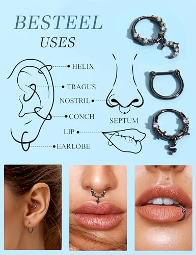 in-demand ! Besteel 20PCS Septum Rings 16G for Women - Hypoallergenic Surgical Steel Daith Piercing Jewelry Cute CZ Dangle Silver Black Gold Nose Ring Clicker for Helix, Tragus, Daith, Cartilage Earrings Hoop