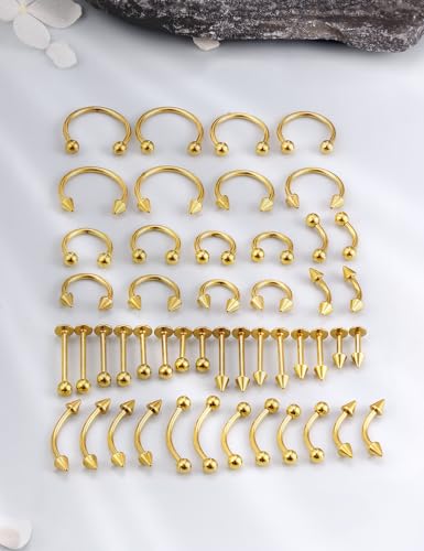 Material: MetalMetal type: Stainless SteelGem type: No gemstone【Order includes】: 16 Pcs horseshoe lip rings piercing of 4 different size, 16pcs lip studs of 4 different size, 16 pcs vertical labret lip jewelry of 4 different size, sturdy and durable, operation is very simple. pleasant to wear without sharp edge【Perfect size】: Lip rings gauge: 16G(1.2mm), bar length:1/4 inch(6mm); 5/16 inch (8mm); 3/8 inch (10mm); 1/2 inch (12mm), top ball and spike: 3mm, color: gold【Suitable for】:These lip piercing set can be used as lip rings,lip studs,lip piercing jewelry,medusa piercing jewelry,vertical labret piercing jewelry,side labret lip ring piercing jewelry,snake bite piercing jewelry,monroe piercing jewelry,ashley piercing jewelry,philtrum piercing jewelry,tragus/helix/forward helix/conch/rook/daith/snug/cartilage/lobe earrings studs piercing jewelry,aslo use as eyebrow ring piercing jewelry,horseshoe septum nose ring and more other body piercing【Material】: Made of 316l surgical steel, highly polished, smooth surface, safe for sensitive skin. simple and elegant. convenient to put in or out. suitable for long time wearing,provides lasting color retention and extremely easy to clean【After-Sales Service】: When you encounter any issues with the size, quality, or any other issues when using our body piercing jewelry. please contact us at any time, Xnsjeyy will solve your problem as soon as possible Perfect for everyday use. first-class materials and excellent craftsmanship ensure long-lasting durability.