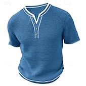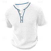 Highlights [Fabric] : Crafted from a breathable waffle-knit fabric, this men's shirt offers a comfortable and textured wear perfect for warm weather. The micro-elastic property adds ease of movement, ensuring all-day comfort. [Fit] : Featuring a loose fit, this Henley shirt enhances comfort and wearability. It is designed to suit a variety of body shapes, providing a relaxed and casual vibe for everyday wear. [Design Highlights] : This shirt boasts a unique V-neck design with a buttoned placket, adding a modern touch to its classic style. The vibrant blue color is offset by white piping around the collar and neckline for added contrast and detail. [Occasions] : Ideal for summer outings, whether you're heading to outdoor street events, casual gatherings, or simply enjoying a day in a relaxed setting. Its versatility makes it a great choice for various occasions, embodying a laid-back yet chic look. [Size Range] : Available in a range of sizes from S to XXXL, ensuring a suitable fit for different body types. Perfect for everyday use. first-class materials and excellent craftsmanship ensure long-lasting durability.