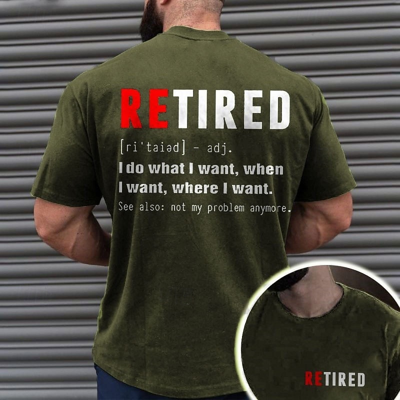 Highlights [Fabric:] Crafted from 100% cotton, this men's T-shirt offers a soft, breathable feel that's perfect for warm summer days. The micro-elastic fabric adds a touch of flexibility, ensuring a comfortable fit. [Fit:] This vintage T-shirt features a crew neck and short sleeves, providing a relaxed, casual style suitable for everyday wear. Available in a range of sizes from S to XXL, it caters to a variety of body types. [Design Highlights:] The standout design element of this graphic tee is the bold lettering on the back. It humorously displays the word RETIRED, with a playful definition and a statement that reads, I do what I want, when I want, where I want. See also: not my problem anymore. The contrasting colors, with RE in red and the rest in white, create a striking visual against the black fabric. [Occasions:] Ideal for casual outings, social gatherings, vacations, or simply relaxing at home, this T-shirt adds a fun and humorous touch to any wardrobe. It's also an excellent gift choice for retirees who enjoy showcasing their sense of humor. [Size Range:] Offering sizes S through XXL, this T-shirt provides options for various body shapes, ensuring a comfortable and flattering fit for all wearers. Perfect for everyday use. excellent materials and excellent craftsmanship ensure long-lasting durability.