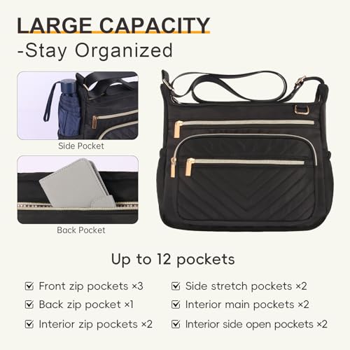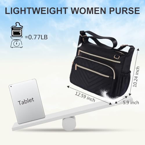 • Efficient Organization: Dimensions: L12.6*W5.9*H10.2 inch, Weight: 0.77LB. This crossbody bags for women has more than 12 functional compartments including front pocket (with built-in key ring), fast access pockets, dual interior zippered pockets, and two side pockets. The women's black purse's multi-pocket design keeps your belongings organized and makes it straightforward to collect your cell phone, wallet, keys, books, umbrella, eyeglasses case, and daily essentials