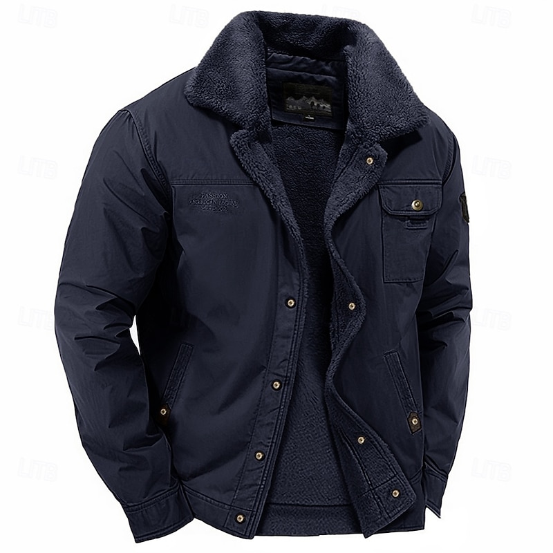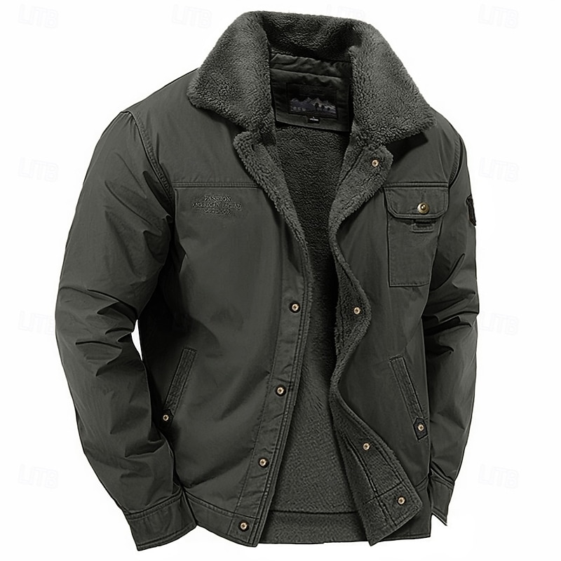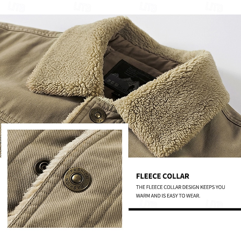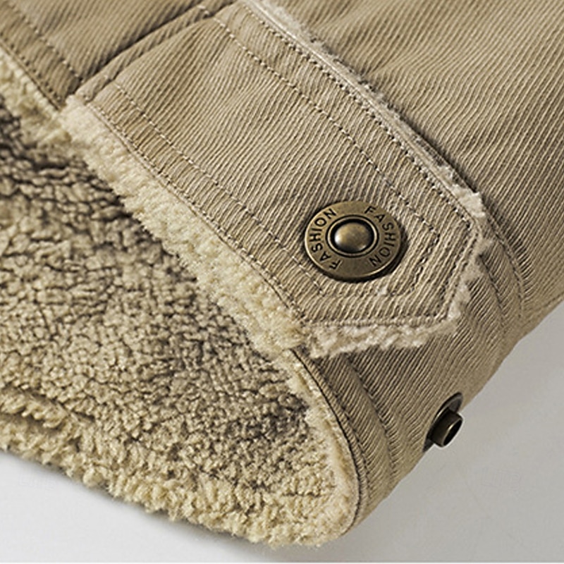 Highlights [Fabric]: Crafted from 100% durable cotton, this men's jacket features an exterior that provides a rugged and weather-resistant finish. The interior is lined with plush faux shearling, ensuring excellent insulation and comfort, making it ideal for winter weather. [Fit]: The jacket is tailored with a relaxed fit, perfect for layering over sweaters or shirts. This design allows for both style and practicality, ensuring you stay warm and pleasant in cold conditions. [Design Highlights]: The jacket showcases a wide, fold-over lapel collar made of the same cozy faux shearling, offering added warmth and a vintage-inspired aesthetic. It features a single-breasted front with button closures and a hidden zipper for secure fastening. Practicality is enhanced with multiple pockets, including two side pockets for hand warming and a buttoned chest pocket for additional storage. The adjustable cuffs ensure a snug fit, keeping out the cold. [Occasions]: Suitable for casual daily wear, office settings, and weekend outings, this jacket seamlessly blends fashion with function. Whether you're heading to work or enjoying a relaxed weekend, itβs a versatile addition to any winter wardrobe. [Size Range]: Available in a wide range of sizes from M to 5XL, this jacket accommodates various body types and preferences, ensuring a comfortable fit for everyone. Perfect for everyday use. superior materials and excellent craftsmanship ensure long-lasting durability.