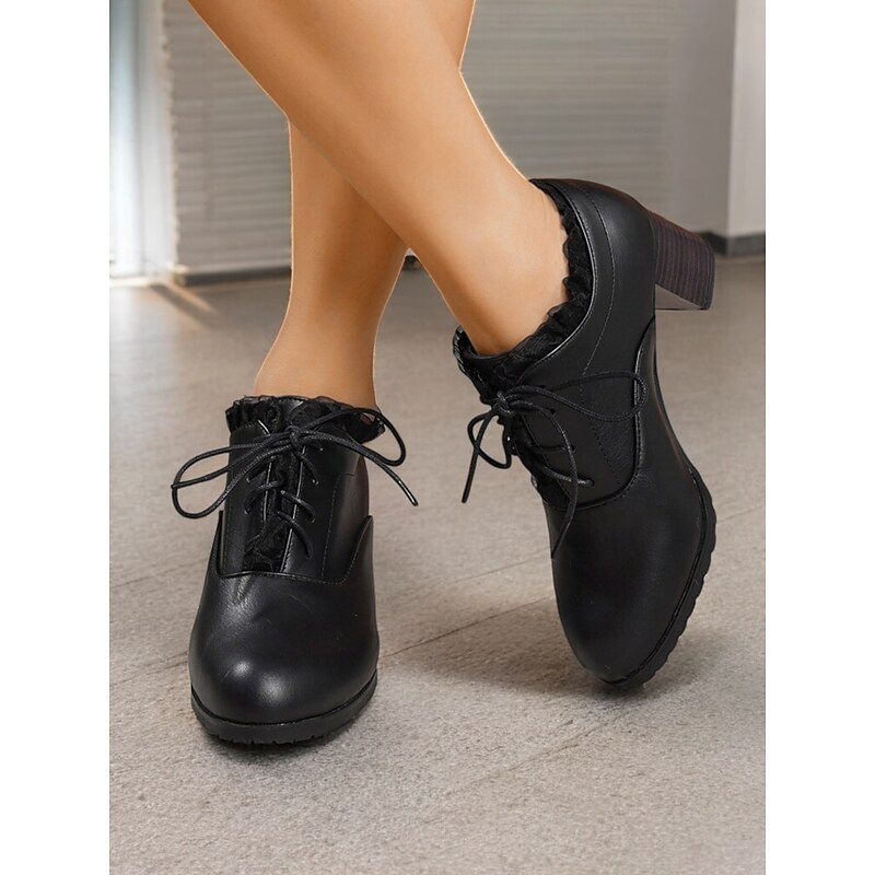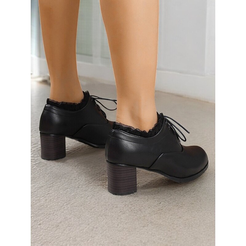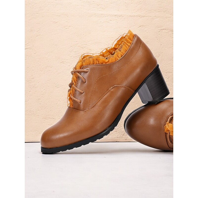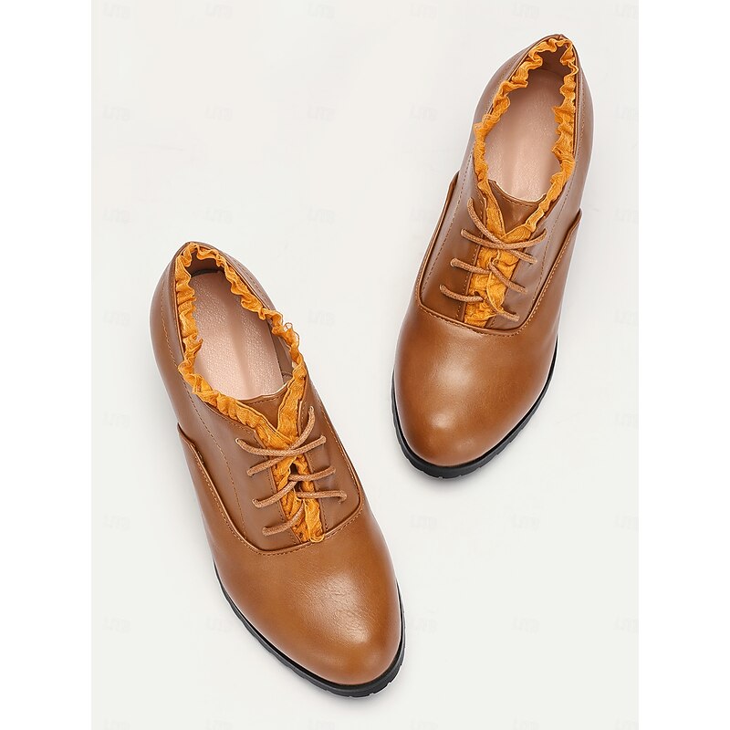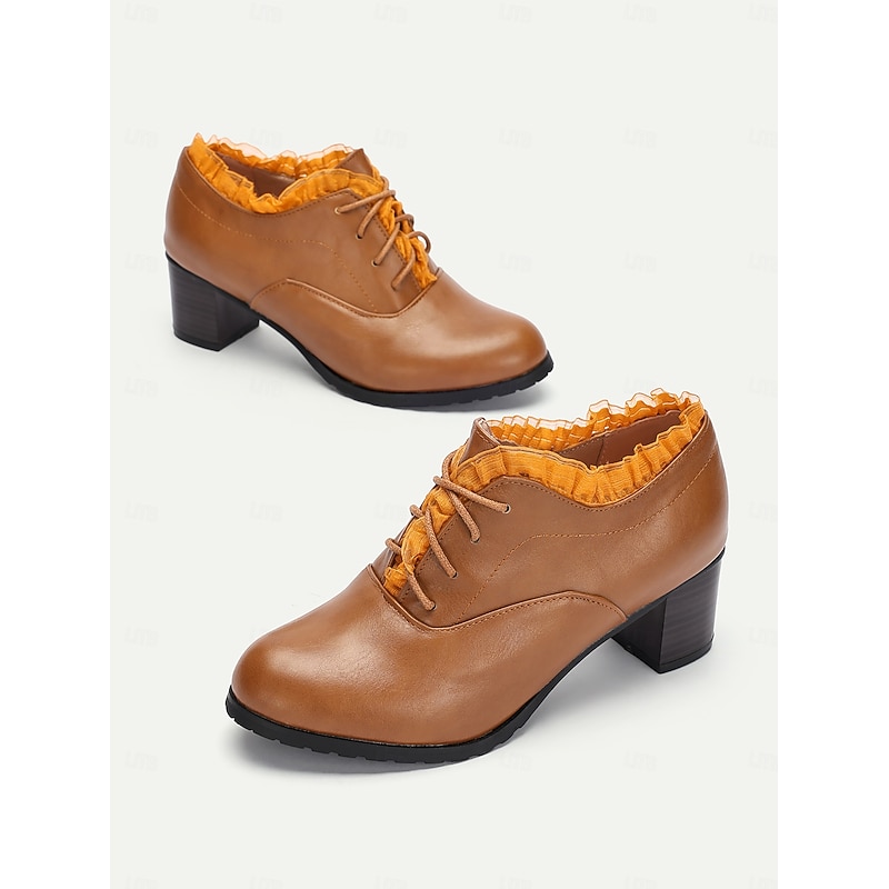 Highlights [Fabric & Material] : These Women's Vintage Lace-Up Faux Leather Oxfords are crafted from premium PU for the upper and synthetic leather lining, providing both style and comfort. The durable construction ensures longevity, making them ideal for everyday wear. [Silhouette] : Featuring a classic Oxford design, these shoes incorporate present-day elements like a sleek, rounded toe and chunky heel, offering both stability and a touch of sophistication. The lace-up closure guarantees a snug and customized fit for optimum comfort. [Design Highlights] : The standout feature of these shoes is the vibrant orange ruffle trim at the top, which adds a playful and feminine flair. Additionally, decorative ribbon ties enhance the aesthetic appeal, blending elegance with a hint of fun. [Occasions] : Perfect for work, casual outings, or any daily activities in the Spring, Fall, and Winter seasons. These Oxfords are versatile enough to transition seamlessly from office to weekend gatherings, offering both charm and practicality. [Size Notice] : Available in a range of sizes including US5.5 to US10.5, these shoes fit true to size. Choose your usual size for the best fit and comfort. Perfect for everyday use. first-class materials and excellent craftsmanship ensure long-lasting durability.
