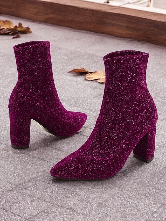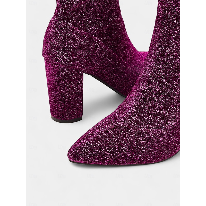 : Crafted from sparkling glitter fabric, these women's ankle boots exude elegance in a rich shade of purple. The high-quality synthetic material offers both glamour and durability, ensuring a standout appearance.