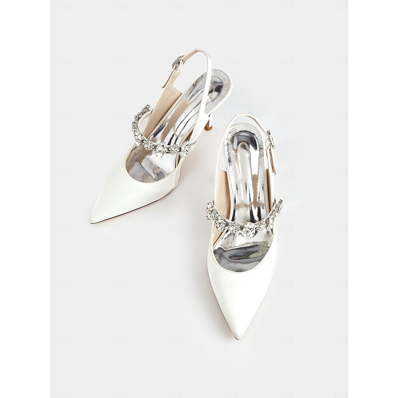 in-demand ! Women's White Satin Slingback Heels with Rhinestone Embellishments – Elegant Pointed-Toe Shoes for Weddings and Formal Occasions