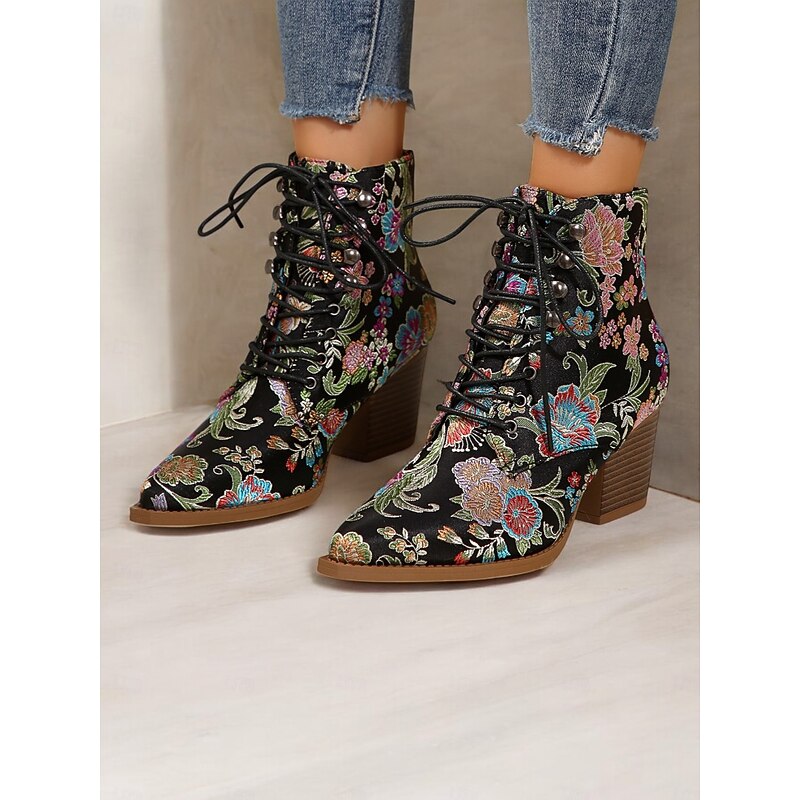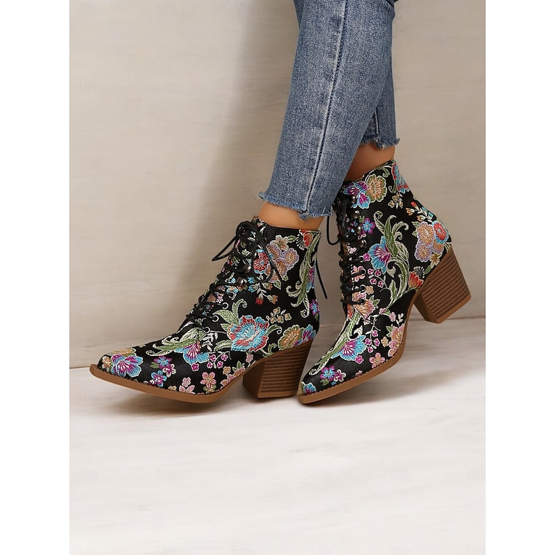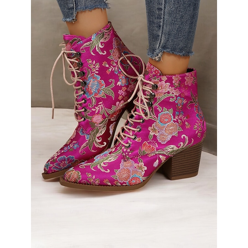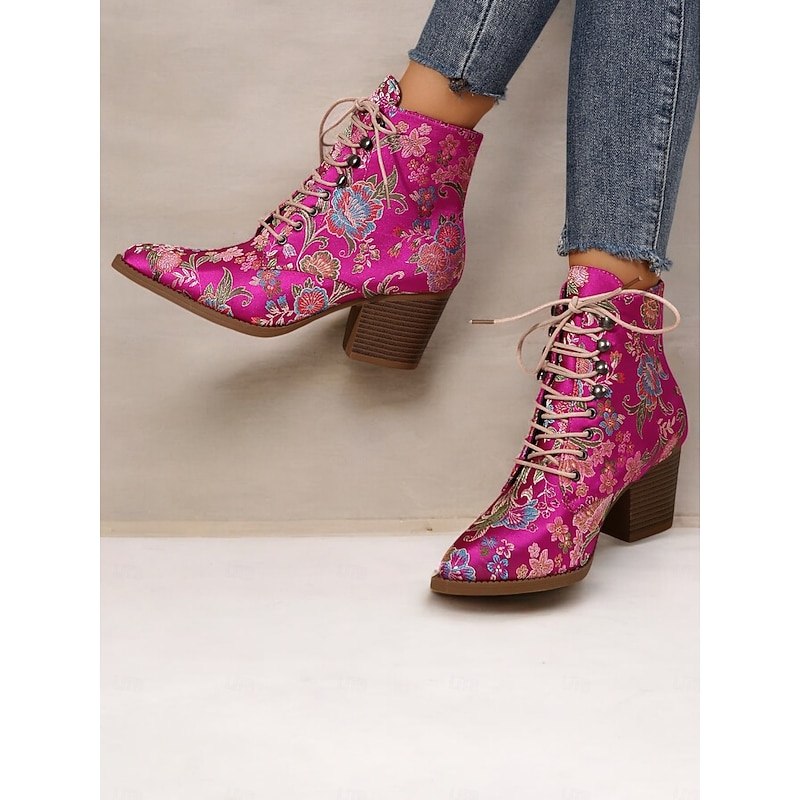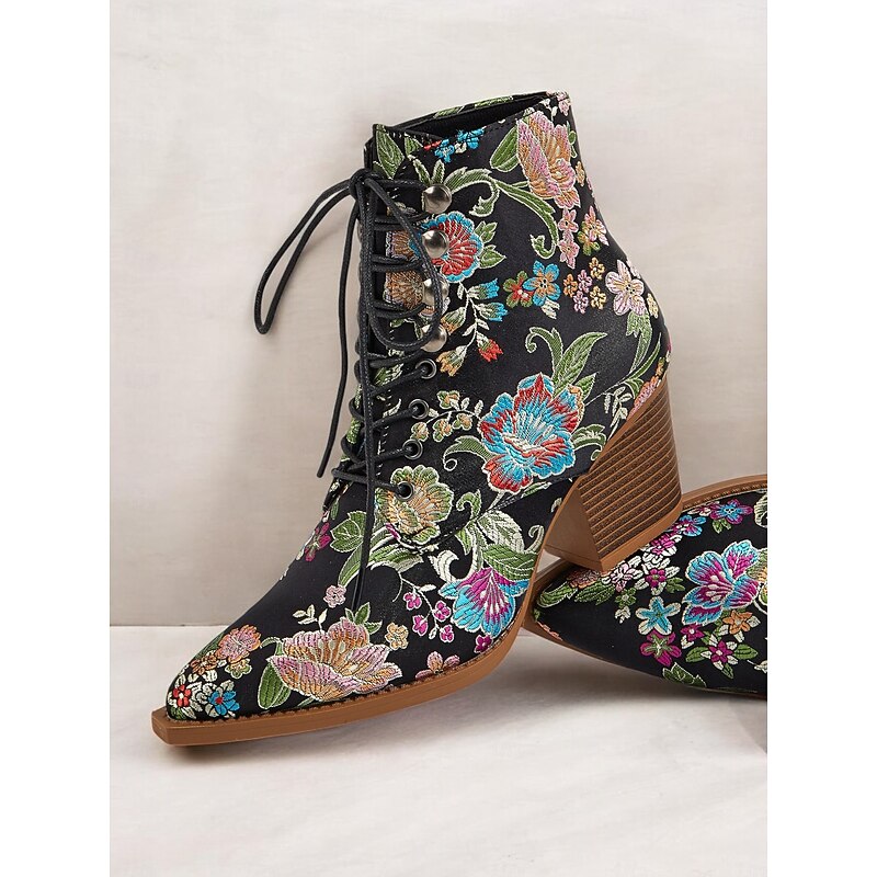 Highlights [Fabric and Material] : Crafted from vibrant satin, these ankle boots feature a luxurious and smooth texture, offering a stunning visual and tactile appeal. The uppers are complemented by textile linings, enhancing both comfort and breathability. [Silhouette and Shape] : Designed with a sturdy chunky heel, these boots provide extra height while ensuring comfort and stability. The pointed toe adds a sleek and chic touch, making these boots impeccable for both casual and dressy occasions. [Design Highlights] : These boots are adorned with exquisite floral embroidery that brings a boho-chic flair. The lace-up design adds a casual yet sophisticated touch, while the ankle strap ensures a secure fit. The standout floral pattern gives the boots a vintage charm. [Occasions] : Ideal for a range of settings, from daily wear to work, or even festive parties and gatherings. These boots add a pop of color and style to any outfit, making them an excellent choice for casual, party, or boho-chic ensembles across the spring, fall, and winter seasons. [Size Range and Fit] : Available in a variety of sizes including US6 to US10.5, these boots are true to size. It is recommended to select your usual size to ensure the best fit and comfort. Perfect for everyday use. first-class materials and excellent craftsmanship ensure long-lasting durability.