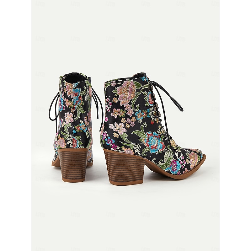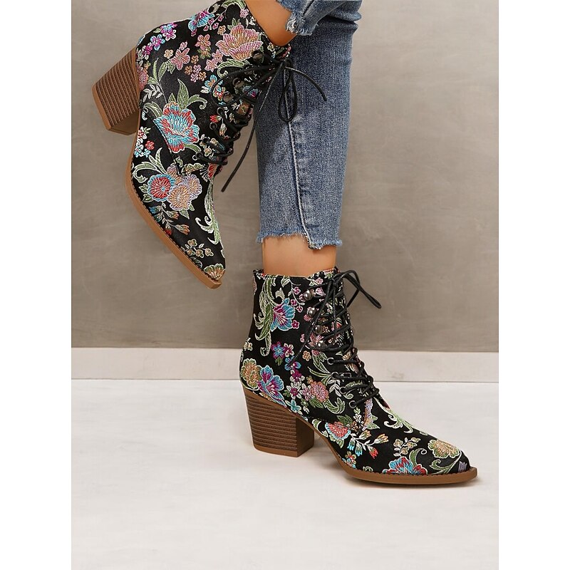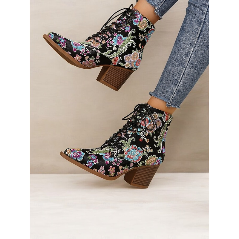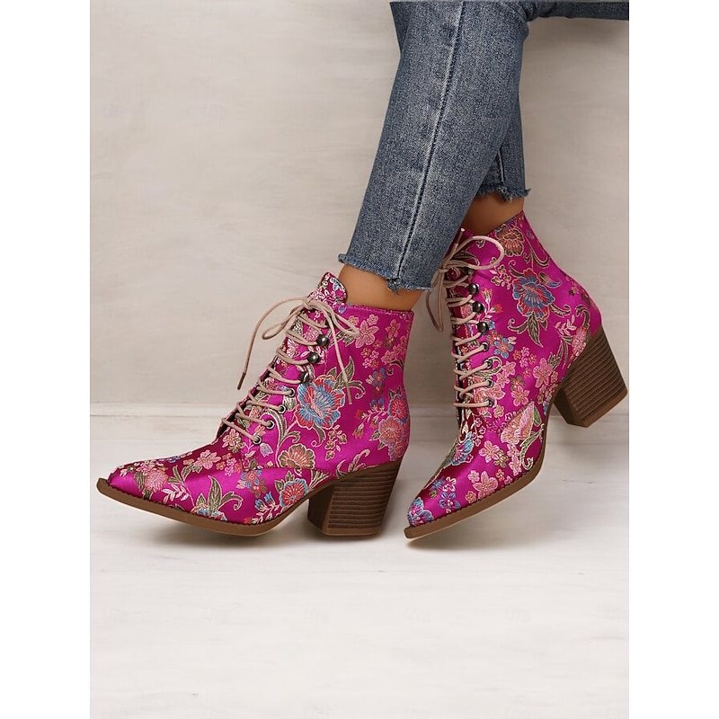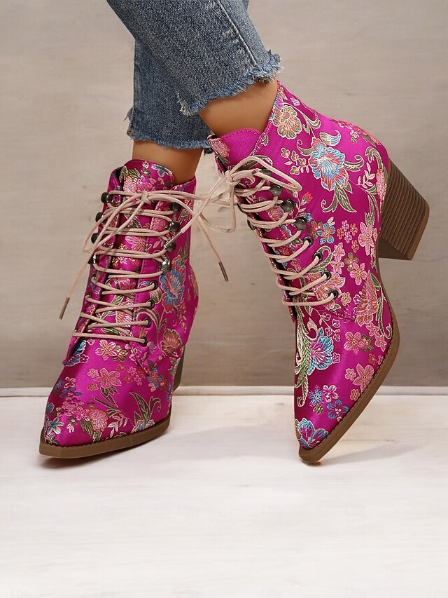 Highlights [Fabric and Material] : Crafted from vibrant satin, these ankle boots feature a luxurious and smooth texture, offering a stunning visual and tactile appeal. The uppers are complemented by textile linings, enhancing both comfort and breathability. [Silhouette and Shape] : Designed with a sturdy chunky heel, these boots provide extra height while ensuring comfort and stability. The pointed toe adds a sleek and chic touch, making these boots impeccable for both casual and dressy occasions. [Design Highlights] : These boots are adorned with exquisite floral embroidery that brings a boho-chic flair. The lace-up design adds a casual yet sophisticated touch, while the ankle strap ensures a secure fit. The standout floral pattern gives the boots a vintage charm. [Occasions] : Ideal for a range of settings, from daily wear to work, or even festive parties and gatherings. These boots add a pop of color and style to any outfit, making them an excellent choice for casual, party, or boho-chic ensembles across the spring, fall, and winter seasons. [Size Range and Fit] : Available in a variety of sizes including US6 to US10.5, these boots are true to size. It is recommended to select your usual size to ensure the best fit and comfort. Perfect for everyday use. first-class materials and excellent craftsmanship ensure long-lasting durability.