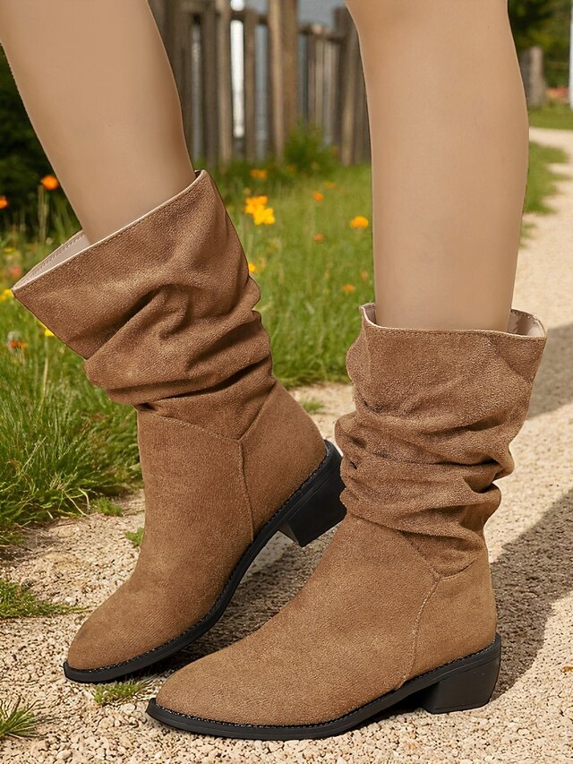 Why Choose Women's Brown Faux Suede Slouch Boots with Low Heel, pleasant Mid-Calf Pull-On Boots for Casual Fall and Winter Outfits?