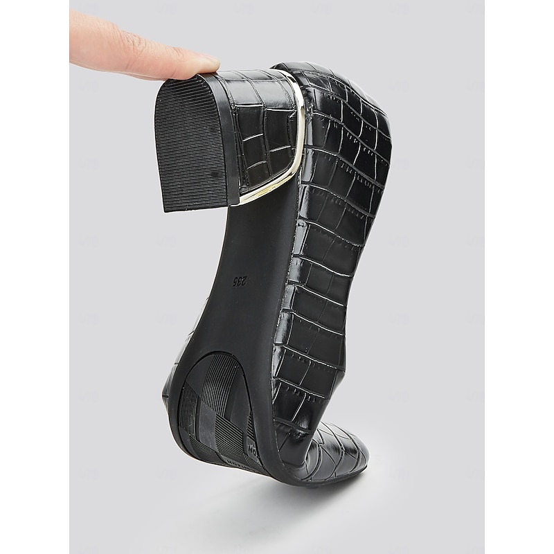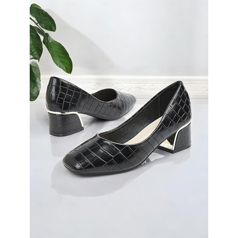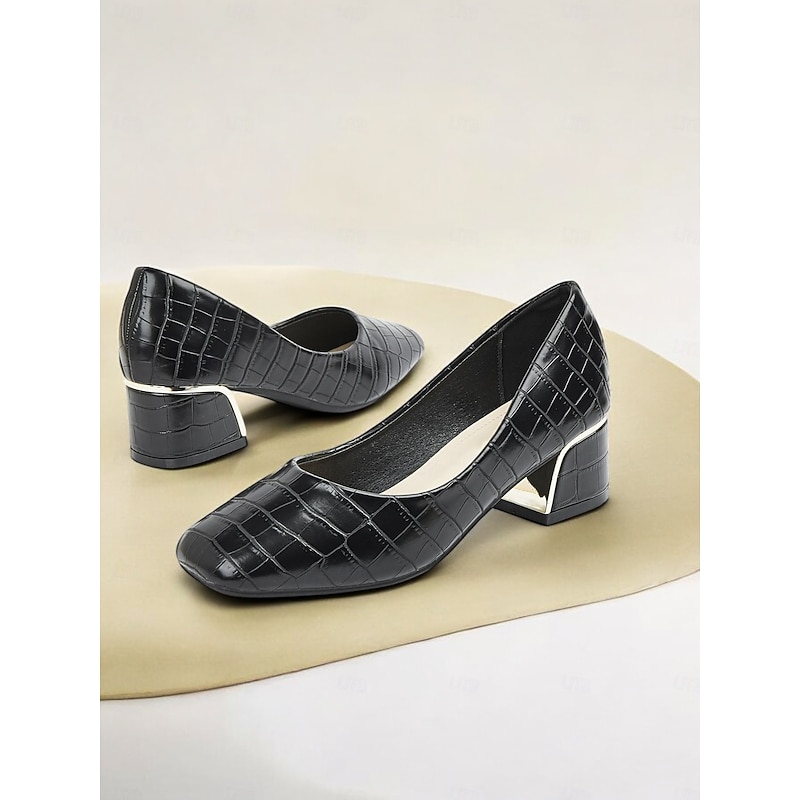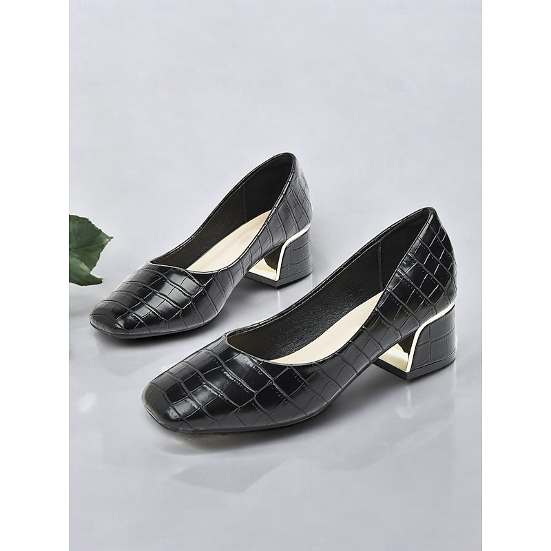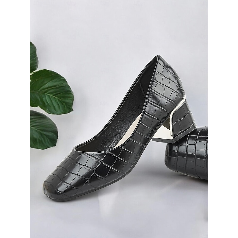 in-demand ! Women's Black Croc-Embossed Leather Block Heel Pumps with Metallic Accent – Elegant Office & Evening Wear Shoes