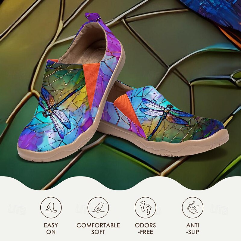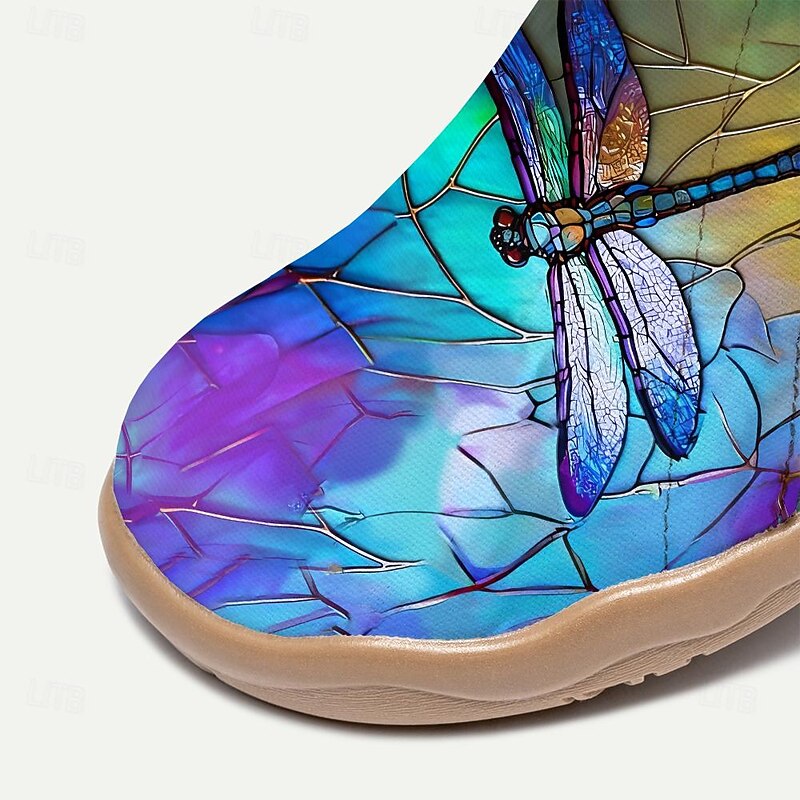 Highlights [Fabric] : Crafted from high-quality canvas, these women’s sneakers offer a vibrant and artistic look with a one-of-a-kind painted dragonfly motif. The breathable material ensures lasting comfort for extended wear. [Construction] : With a flat heel and slip-on design, these sneakers provide ease and comfort for everyday activities, perfectly blending casual style with functionality. [Design Highlights] : These sneakers feature an eye-catching design, showcasing an artistic stained glass effect in blue, green, purple, and orange hues. The slip-on style is complemented by a durable rubber outsole, providing both convenience and traction. [Occasions] : Ideal for daily wear, travel, vacations, or any casual outing, these sneakers are perfect for adding a pop of artistic flair to your ensemble. Whether you’re taking a stroll or meeting friends, they offer both style and practicality. [Size Range] : Available in a variety of sizes, including US6 to US10, ensuring a comfortable fit for all-day wear. Perfect for everyday use. first-class materials and excellent craftsmanship ensure long-lasting durability.