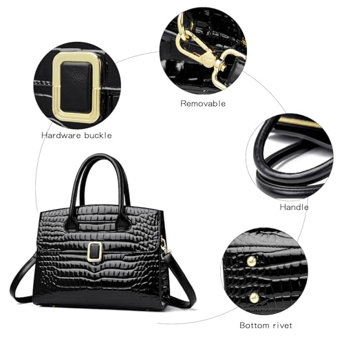 • [WELL MADE] This women satchel tote handbag is made of magnificent vegan leather which is patent and water-resistant. The material has shiny glory coat and the crocodile pattern that makes it looks high-end and dressy. The front decor, attached D-rings, the zip pullers and the bottom rivets all are made of golden-tone heavy-duty hardware. The fixed bottom and the little stiff body makes this women's handbags and purses always keep in shape that it will keep you elegant anytime.
