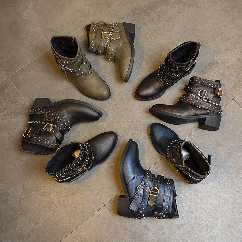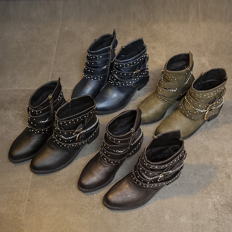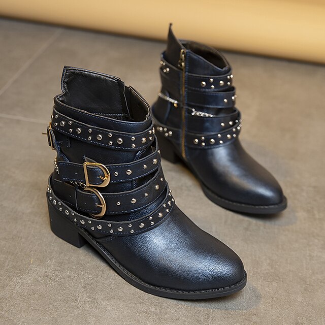 Highlights [Material] These ankle boots are made from high-quality polyurethane (PU) and feature a rubber outsole, ensuring durability and a sleek, polished finish. The combination provides both sturdiness and style, perfect for everyday wear. [Silhouette] With a low, chunky heel and platform design, these boots offer a stable and pleasant fit. The pointed toe adds a chic touch to the overall look, making them suitable for extended wear without compromising on style. [Design Highlights] The edgy design includes multiple straps embellished with silver-tone studs and two prominent gold-tone buckles, offering an adjustable fit and adding a layer of sophistication. A convenient side zipper allows for easy wear, enhancing the boots' practicality. [Occasions] Ideal for various occasions, these versatile boots are perfect for daily wear, weekend outings, or even work settings. Whether dressing up a casual outfit or complementing a semi-formal look, they make a striking statement. [Size Notice] Available in a range of sizes from US6 to US10.5, allowing you to select your usual size for a comfortable fit. Perfect for everyday use. first-class materials and excellent craftsmanship ensure long-lasting durability.