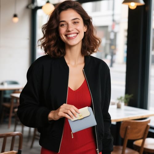 Bifold Womens Wallet, Leaf Snap Card Holder Wallet Cute Small Wallets for Women with Zipper Coin Pocket ID Window (Blue)