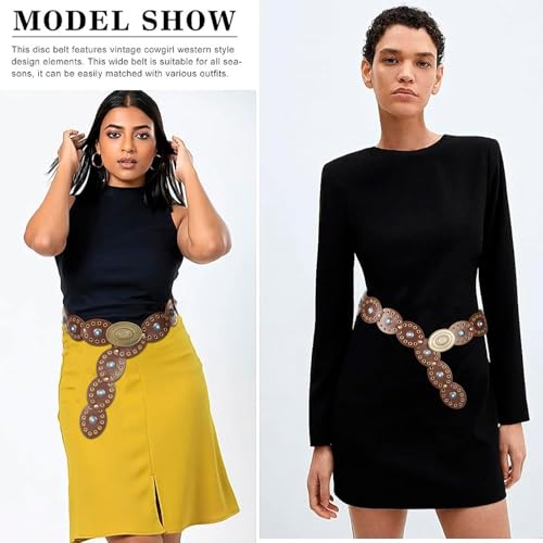 Origin: ImportedWestern Style Belt: This disc belt is made of PU leather and alloy, each disc does not have any sharp edges, not easy to fade or break,wear-resistant and durablity. Give your a sense of fashion lookingSize: The cowgirl concho belt length :110cm/43.3inches, suitable for most women and ladies,fits waists up to 38 inches. You can adjust the waist to the right position according to your personal favourite. Easy put on and take offDisc Design: Each disc on the belt can be rotated at will,and the round decorative disc with chic engraving has a western and boho style, giving it a chic and unique look that's perfect with jeans and dressesWell Matching: The bohemian belt features a concho buckle and turquoise decorative disc design, suitable for a variety of jeans, skirts and dresses, etc., showing your charm and western style, classic and eye-catching, making you stand out from the crowd.Fashion Accessories: The cool big chunky belt is not only suitable for daily wear, but aslo pretty for Music concert outfit,Festival,Halloween costume and western theme party,dancing, steampunk, gothic costumes and so on Perfect for everyday use. first-class materials and excellent craftsmanship ensure long-lasting durability.