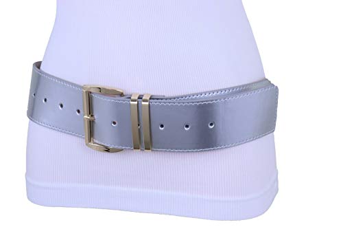 Women Fashion Wide Belt Faux Leather Gold Metal Buckle Plus Size Fit M L XL (Silver - patent faux leather)