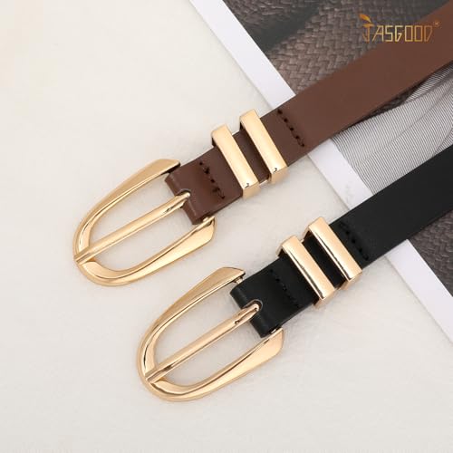2 Pack Plus Size Women's Skinny Genuine Leather Belts with Gold Buckle for Jeans and Dresses