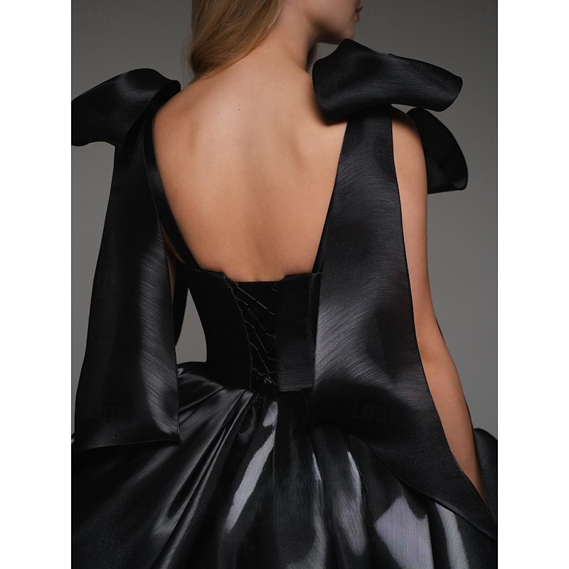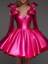 Featuring a strapless sweetheart neckline that exudes sophistication, the dress is adorned with voluminous puffed sleeves and large, dramatic bows for a playful yet elegant look. The short, flared skirt adds a youthful and dynamic touch to the ensemble.