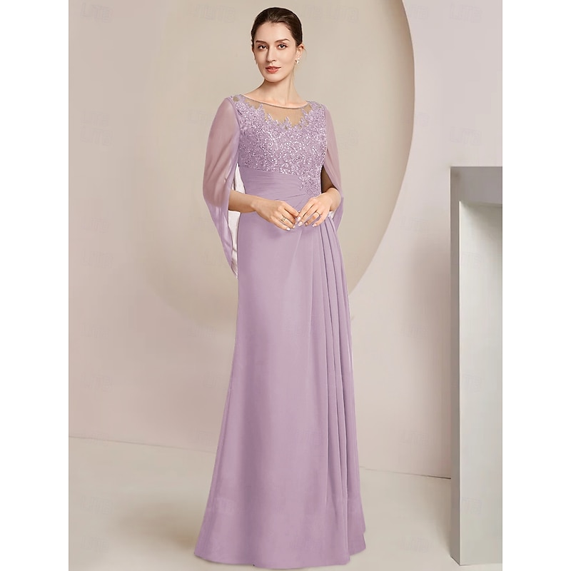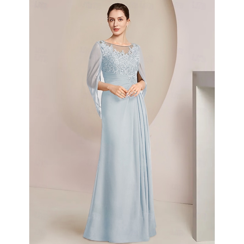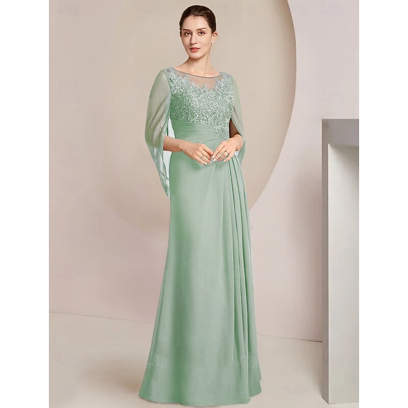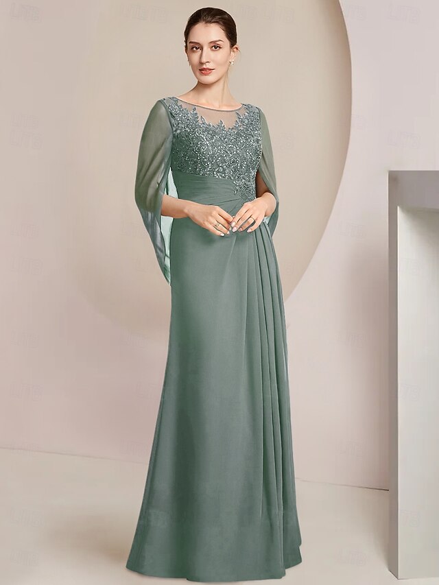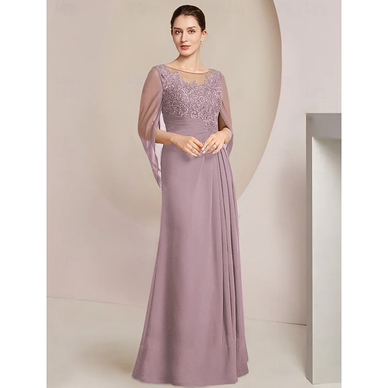 More information about Sheath Dress Mother of the Bride Dress Elegant Jewel Neck Floor Length Chiffon Half Sleeve with Lace Side-Draped Solid Color