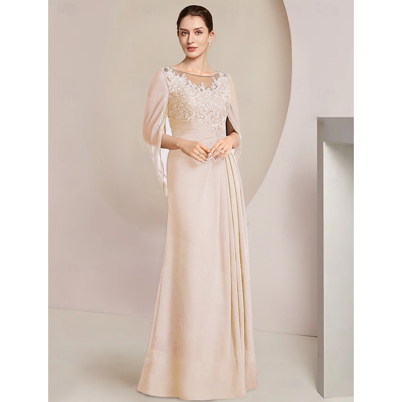 Highlights [TS Sheath Dress Mother of the Bride] [Fabric]: Crafted from high-quality chiffon, this gown provides a lightweight, breathable feel, perfect for formal events. The elegant lace embellishment on the bodice adds sophistication, complemented by delicate, sheer detailing. [Silhouette]: This floor-length gown boasts a sheath silhouette, creating a fitted look that flatters and elongates the figure. The fitted waistline transitions into a gently pleated skirt, offering a graceful flow to the floor. [Design Highlights]: Featuring an illusion neckline and half sleeves crafted from soft, sheer fabric, this dress delivers a whimsical cape-like effect on the arms. The bodice's intricate floral lacework adds a touch of femininity and elegance, while the side-draped design enhances the dress’s new-age appeal. [Occasions]: An ideal choice for weddings, galas, and elegant evening events, this dress embodies iconic style with a modern edge. Whether for the mother of the bride or a distinguished guest, it promises to make a statement. [Size Range]: Available in a wide range of sizes from US 0 / UK 2 / EU 30 to US 26W / UK 30 / EU 56, with options for custom measurements. This ensures a perfect fit for any body type, enhancing comfort and confidence at any event.