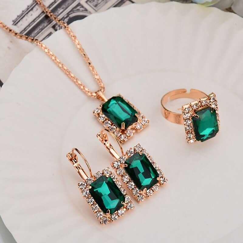 - A stunning set of three pieces of women's jewelry, including hoop earrings, a necklace, and a ring