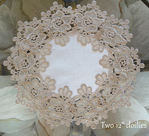 - Light Ivory White & Solf Gold Lace ~ Set of Two 12" Doilies