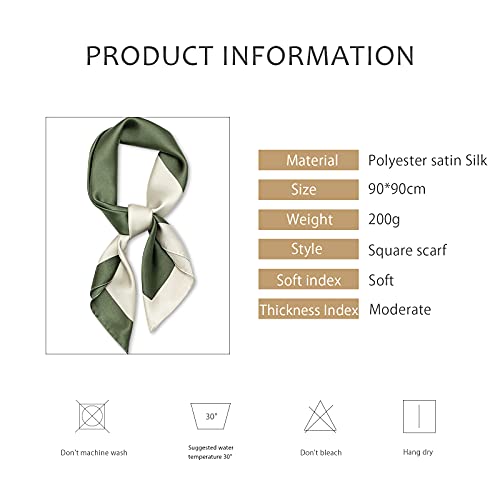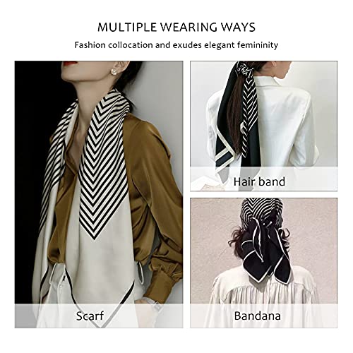STYLE: Classic stripe printing pattern, fashionable collocation and exudes elegant femininity. Retro leopard and paisley print, noble and luxurious. The color blocked geometric pattern is distinct and cheerful, with a striking and eye-catching collision of multiple colors, presenting a strong artistic style. Different silk scarf styles to show your diverse collocations. Excellent printing and dyeing process and good color fastness. Strictly control the weaving technology to ensure decent.ELEGANT ACCESSORIES: Add square scarves decoration to your daily clothing, break the dullness and refuse monotony. The scarf help you transform business attire into your own fashion style. It will help you match your casual wear, work uniforms, dresses for adding a stylish edge.FABRIC: Soft colors, silk feeling texture, and good drape effect. Natural hypoallergenic dye, skin-friendly and breathable. Smooth and soft to the touch, giving you an truly comfortable experience.VARIOUS WAYS TO WEAR: 90cm x 90cm. The kerchief is a truly versatile fashion accessories, which can be used as a headdress, neck scarf and wristband as well as for hat and handbag decoration. In the Spring and autumn, the scarf will keep you warm and protect you from the cold breeze.IDEAL GIFT: 's scarf is an ideal accessory or gift for everyone. Available in a range of color and variety of patterns. Our products are suited to all personal tastes. for Birthdays, Weddings, Anniversaries, Valentine's Day, Mother's Day, Christmas etc. Perfect for everyday use. first-class materials and excellent craftsmanship ensure long-lasting durability.