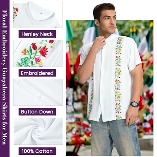 Fabric type: 100% ViscoseOrigin: ImportedClosure type: ButtonNeck style: V-NeckPerfect for Cinco de Mayo & Mexican Celebrations: Make a bold entrance at your next fiesta with this Zando Cinco de Mayo shirt for men. Inspired by traditional Mexican culture, it's the perfect pick for parties, festivals, and themed events. With vibrant floral embroidery and authentic flair, it's built for fun and made to stand out.Lightweight & Breathable Comfort: Made from 100% soft viscose, this fiesta costume is super breathable and keeps you cool no matter how hot the party gets. The short sleeves and relaxed fit make it ideal for dancing, grilling, or chilling at the beach in total comfort.Eye-Catching Floral Embroidery: Two columns of vivid embroidered flowers run down the front, adding a splash of bold color and festive style. Whether it’s Cinco de Mayo or a casual night out, this Mexican-style outfits adds instant energy and charm.Classic Guayabera Vibe with a Twist: This floral cloth combines Cuban guayabera style with modern Mexican-inspired flair. The button-down front and symmetrical embroidery offer a clean, structured look that’s great for both casual wear and dressy occasions.Great Gift for Adult Men: Looking for a one-of-a-kind gift for him? This embroidered Mexican shirt makes a thoughtful present for adult men who love bold style and cultural fashion. Ideal for birthdays, holidays, or Father's Day—it's a sure hit for any fiesta-loving guy. Perfect for everyday use. first-class materials and excellent craftsmanship ensure long-lasting durability.