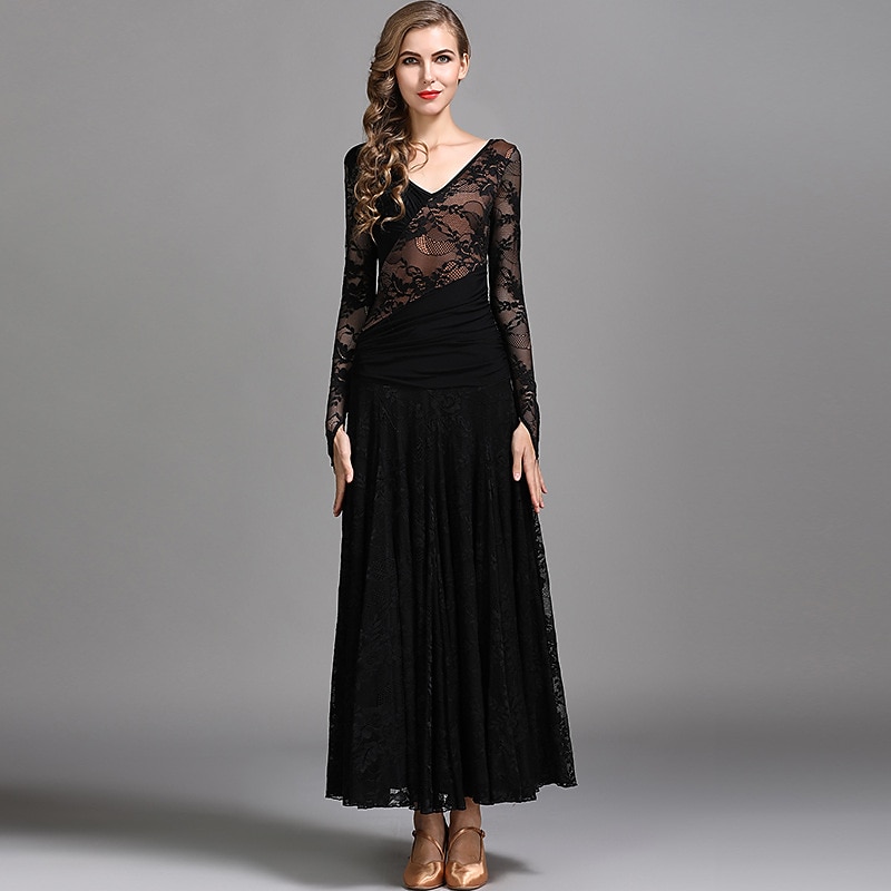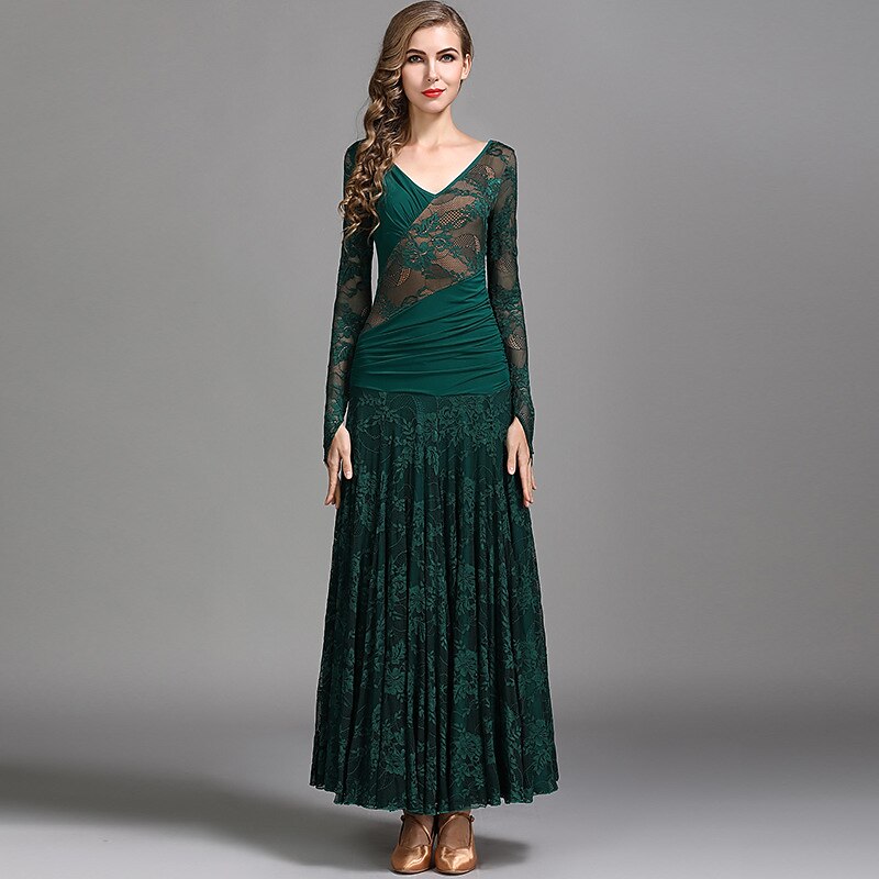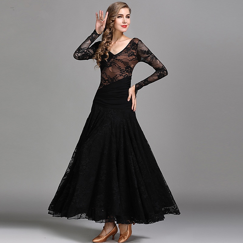 in-demand ! Ballroom Dance Dress Ruching Split Joint Women's Performance Training Long Sleeve Natural Lace Milk Fiber