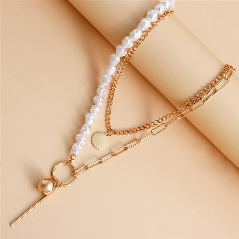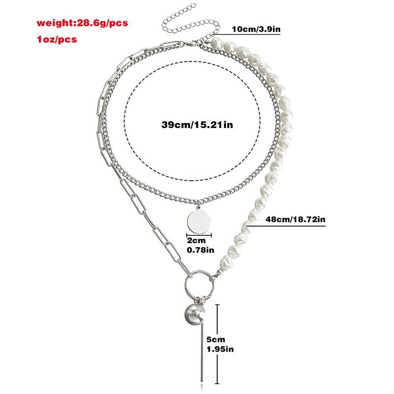 Highlights [Fabric] : Crafted from a combination of alloy and imitation pearl, this necklace offers a refined elegance with a touch of glamour. The durable materials ensure long-lasting wear, making it an ideal accessory for a variety of occasions. [Style] : This double-layered pendant necklace is designed to be fashion-forward and personalized, featuring three distinct layers. The elegant gold and silver options provide a versatile and sophisticated style that complements various outfits, whether casual or formal. [Design Highlights] : The necklace boasts a distinctive combination of elements across its layers. The sleek gold chain with flat links exudes simplicity and elegance. Irregularly shaped imitation pearls add a classic touch on the second layer, while the third layerβs longer chain, highlighted by a bold circular pendant and a dangling rod and sphere charm, introduces a modern and chic flair. [Occasions] : Perfect for parties, wedding celebrations, evening events, birthdays, and Christmas gatherings. This necklace seamlessly adapts to both special occasions and daily wear, making it a versatile staple in any wardrobe. [Size Range] : This necklace set is designed to accommodate a variety of necklines, ensuring flexibility and style for women. Available in both gold and silver color options to match different preferences and fashion choices. Perfect for everyday use. superior materials and excellent craftsmanship ensure long-lasting durability.