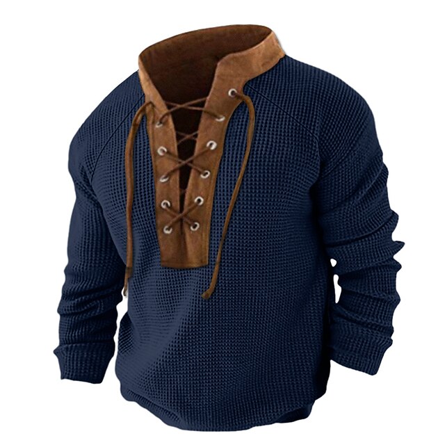 More information about Men's T Shirt Waffle Knit Tee Tee Top Long Sleeve Shirt Long Sleeve Standing Collar Spring & Fall Color Block Fashion Designer Basic Patchwork Drawstring Vacation Street Going out Red Navy Blue khaki