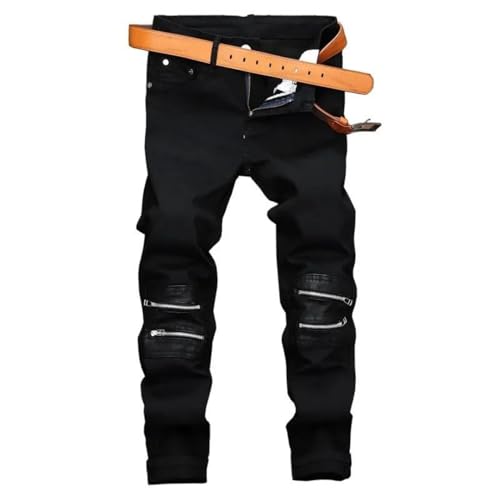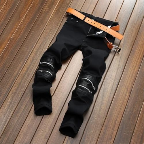 in-demand ! Men's Leather Knee Zip Jeans (No Belt) Stretch Slim Straight Motorcycle Denim Trousers