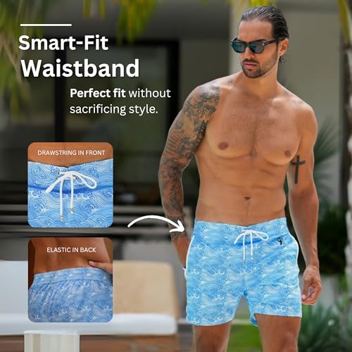 Make Waves Blue Swim Trunks - 5" - 4 Way Stretch, speedy Dry, Chlorine Resistant, Built in Compression Liner