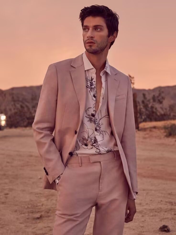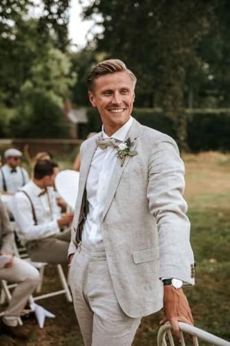 HUUTOE Mens Linen Suit Slim Fit 2 Piece Beach Wedding Summer Wear Prom Party 2 Button Linen Blazer Jacket and Pants Suits Set