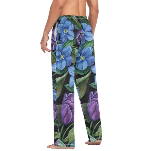 Men's Pajama Pants Blue Flowers Sleep Pajama Lounge Pant with Pockets, Elastic Waistband