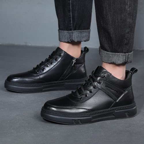 in-demand ! Men's Black High-top Casual Leather Boots,Round Toe Non-slip Shock-absorbing Side Zip Business Height Ankle Sneakers