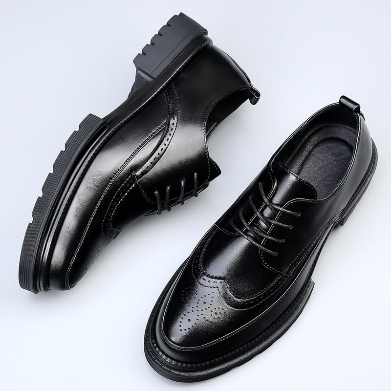Sole material: RubberOuter material: Polyurethane (PU)Closure type: Lace-UpExquisite Material:Meticulously crafted from synthetic leather, these Men's Platform Dress Shoes not only guarantee long - term durability, but also their timeless, refined appearance.Distinctive Design Aesthetics:Combining the traditional appeal of brogue wingtip oxfords with a classic lace-up fastening, they seamlessly blend heritage charm with contemporary fashion trends. The bold lug sole serves as a focal point, adding a touch of ruggedness to any ensemble.Practical functionality for everyday life:Equipped with a slip-resistant sole, these shoes offer reliable grip on a variety of terrains, ensuring secure footing with every step. The discreet elevation design subtly enhances your height, giving you a sense of confidence and poise.All-day comfort: With a cushioned insole and a roomy toe box, these shoes are designed for all-day comfort. The breathable lining prevents sweat build-up, so whether you're working long hours or enjoying a casual stroll, your feet will stay fatigue - free.Versatile Style:Ideal for both laid back casual outings and formal work environments. Wear them with jeans for a relaxed, casual look or with a suit for a more formal business meeting or social event. Perfect for everyday use. superior materials and excellent craftsmanship ensure long-lasting durability.